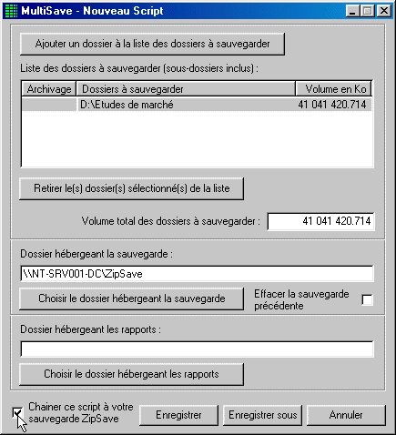 Sélectionner le dossier qui hébergera la sauvegarde des études de marché sur le serveur du service Etudes de marché. - Il ne vous reste plus qu'à cliquer la case à cocher "Chaîner ce script à votre sauvegarde ZipSave" pour que le script soit exécuté automatiquement lors de chaque sauvegarde ZipSave.