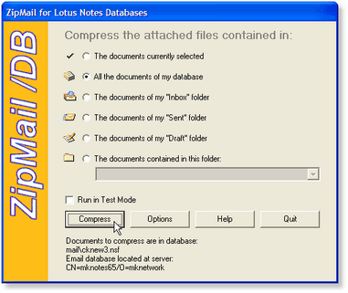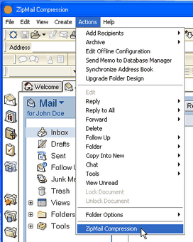 ZipMail /DB Client adds a new Action/ZipMail Compression menu to your IBM Notes Client, enabling you to compress, into industry-standard Zip files, the attached files within existing IBM Notes (email and non-email) NSF database, saving gigabytes of disk space on your Notes servers and/or workstations.